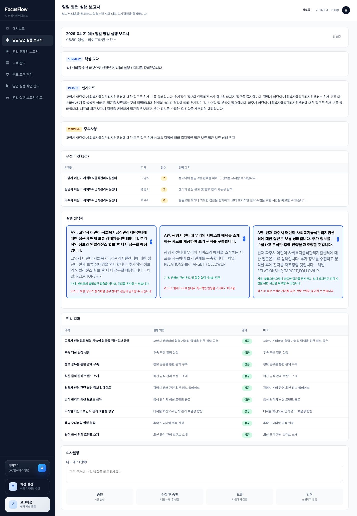 FocusFlow는 영업 전담 인력을 두기 어려운 1인 사업자와 소규모 사업자를 위한 AI 영업지원 서비스입니다. 6개의 AI 에이전트가 시장 리서치, 고객 분석, 영업 전략 수립, 실행 계획 정리까지 분담해 수행하고, 사용자는 매일 아침 준비된 전략과 실행안을 검토하고 승인하면 됩니다. 영업 준비 시간을 줄이고 실행 속도를 높여, 작은 팀도 더 체계적인 영업 운영이 가능하도록 설계했습니다.