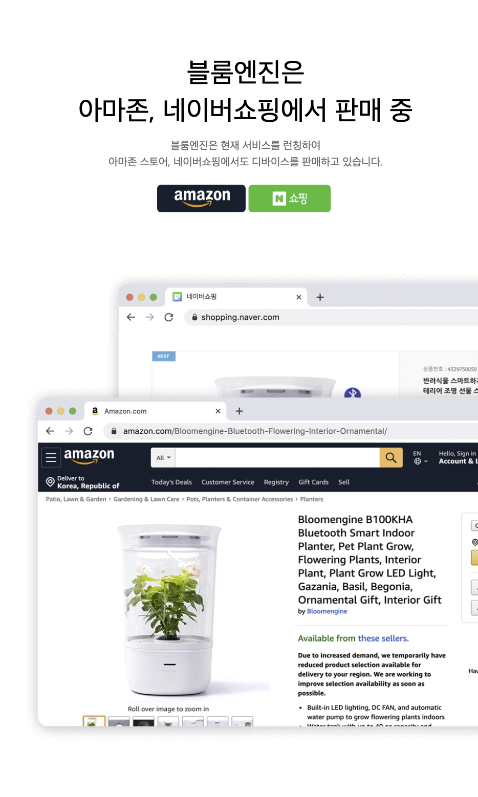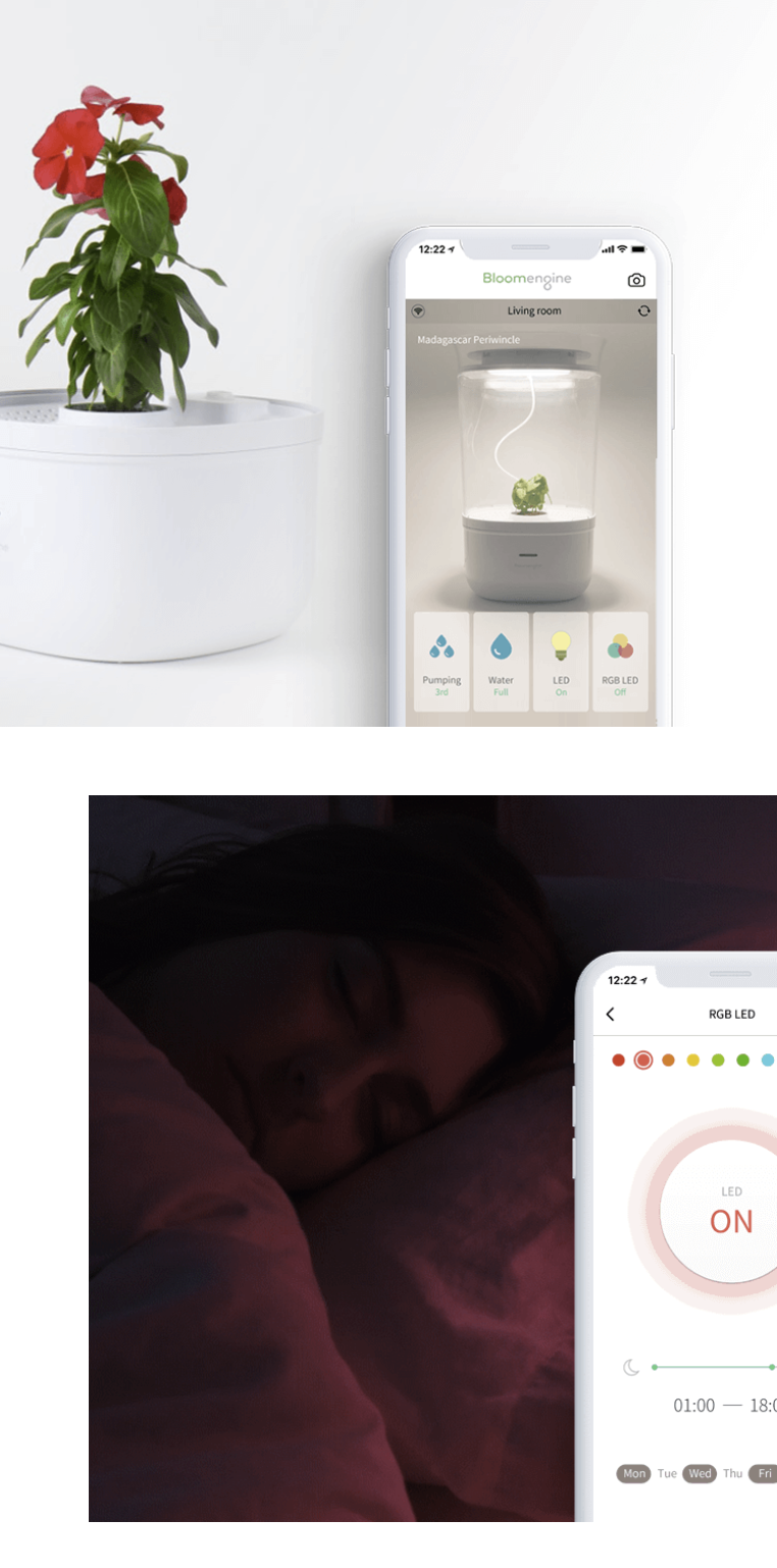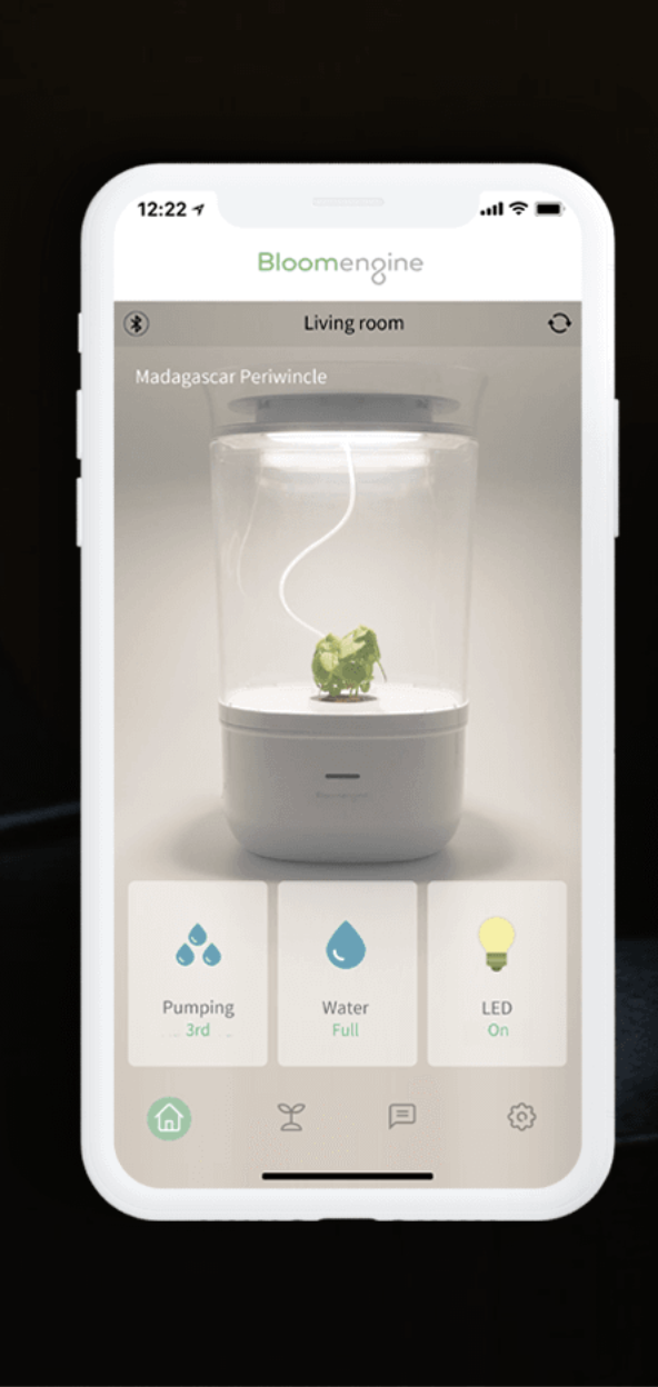 블룸엔진은 IoT 기반 서비스로 회원들이 실내에서 식물을 키우는 스마트 화분입니다. 실내에서 식물을 키우는 스마트 화분을 통해 회원들에게 알림을 전송할 수 있습니다.