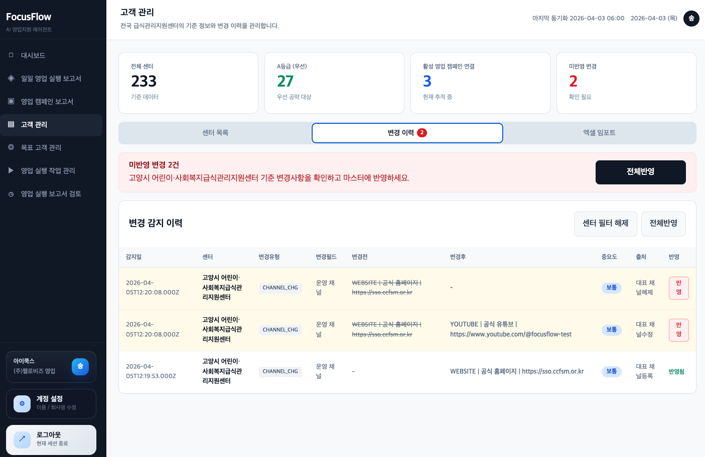 영업 실행 보고서와 캠페인 보고서 기반의 운영 흐름