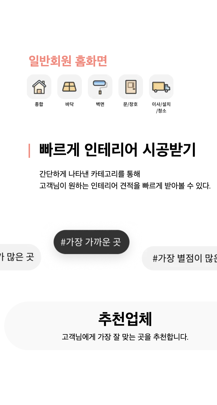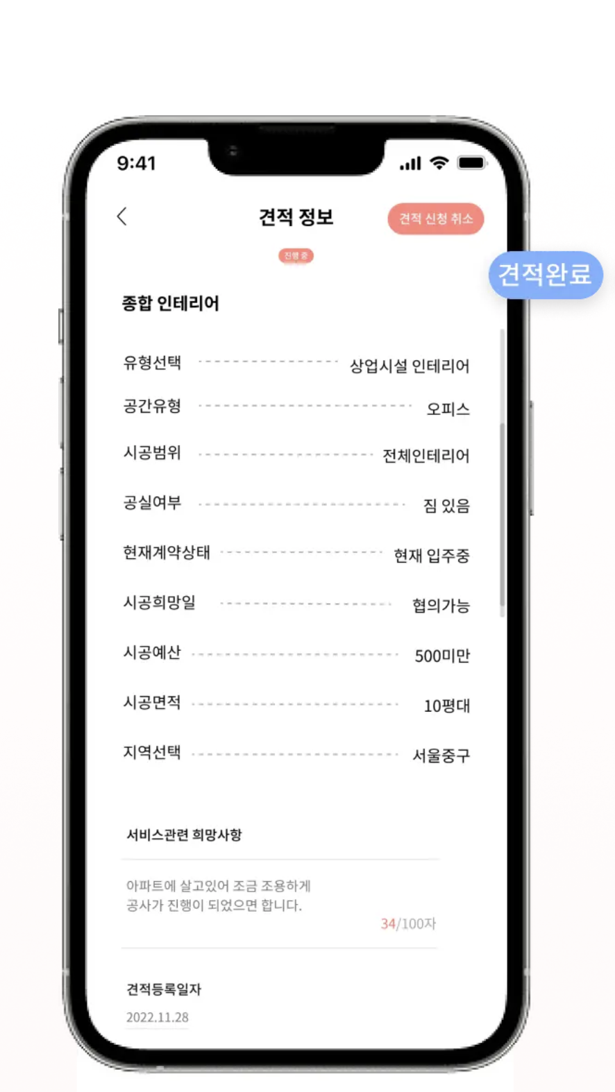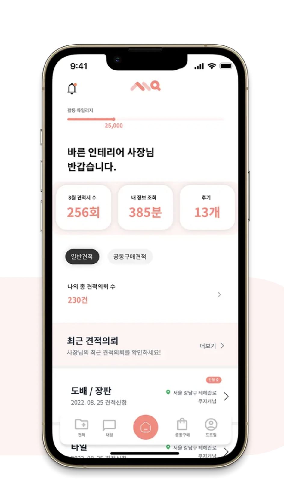 거기엔은 소비자와 인테리어 사업자들과 연결을 통해, 견적서를 받을 수 있는 서비스를 제공하는 플랫폼입니다. 실시간 견적정보, 견적 비교 매칭, 견적 상태 알림 등 편리한 기능을 제공하여 견적 서비스 경험을 혁신합니다.